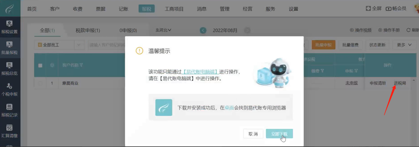 易代账新增登录税务局客户端下载入口,下载后可直接进入税务局,不用下载报税助手,也没有浏览器的要求,可以直接登录。(从批量报税-进税局下载或者首页也可下载)如下图所示: