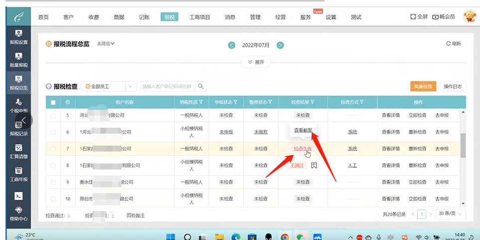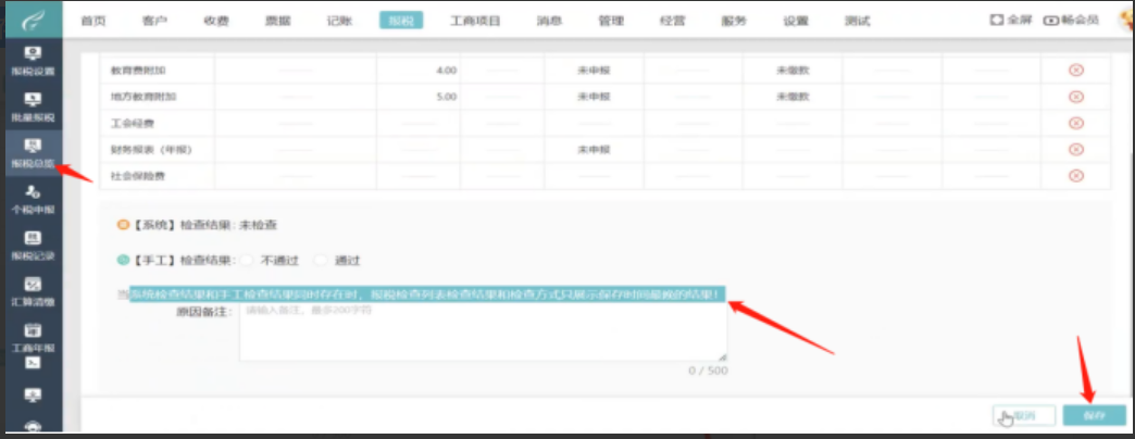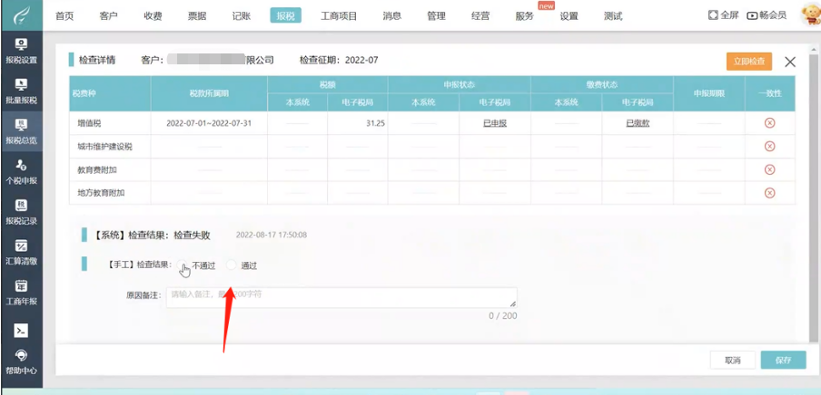 在报税-报税总览-报税检查页面增加了检查失败的提示,可以选择人工检查或者是系统检查