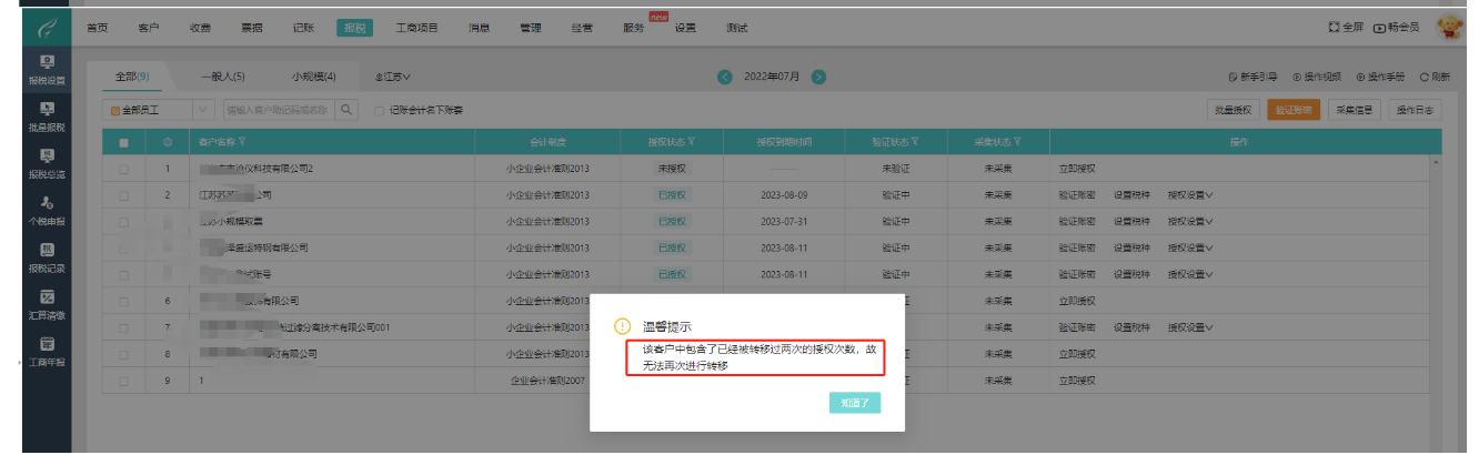 转移授权可以连续转移2次(例如:A转B,B转C,C不能再继续转移),且只能转移给未授权或者授权已经过期的客户,在报税-报税设置-授权转移增加转移说明,提示“转移授权只能授权2次,且只能授权给未授权账套
