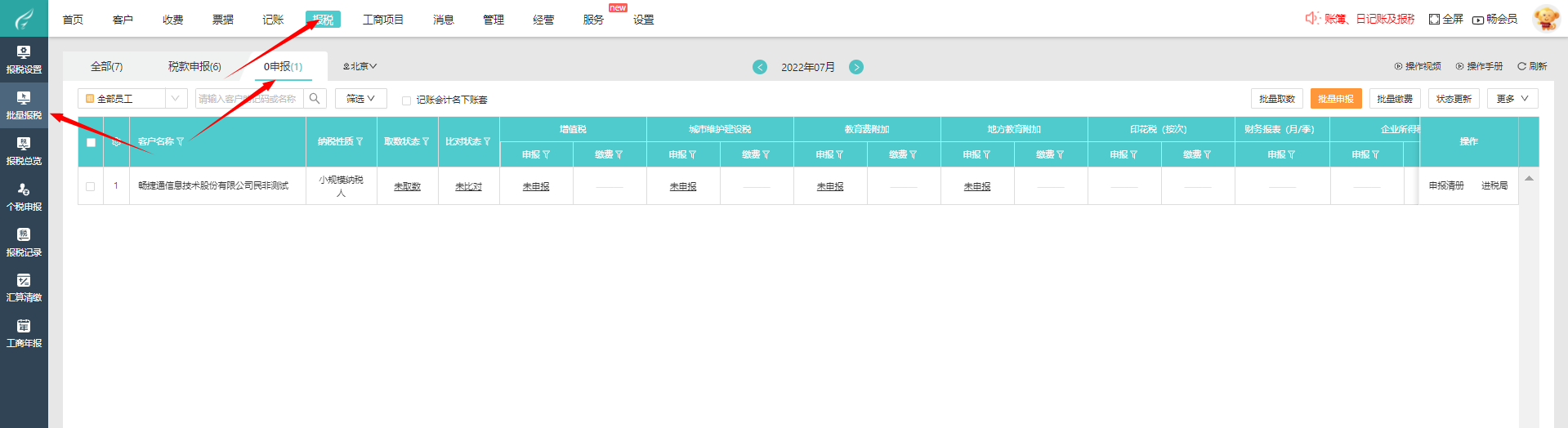 进入【报税】--【批量报税】--【零申报】页面,可以进行已设置为零申报的账套的一键申报。