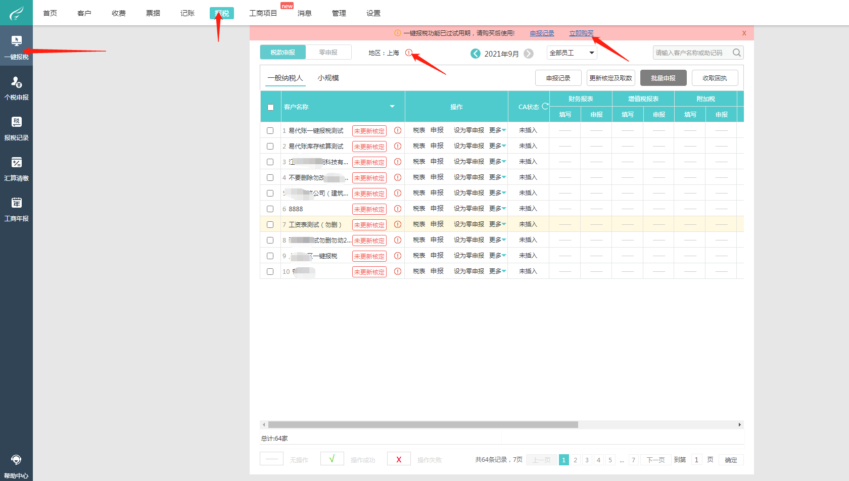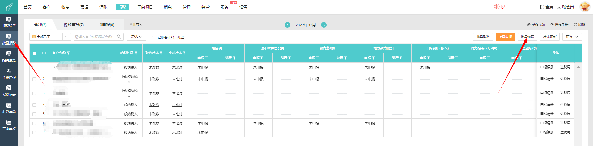 执行申报完成后在一键报税界面会有对应税种申报情况的反馈,在申报成功未缴费的情况下,可以勾选对应客户去缴费,缴费流程与申报基本一致。