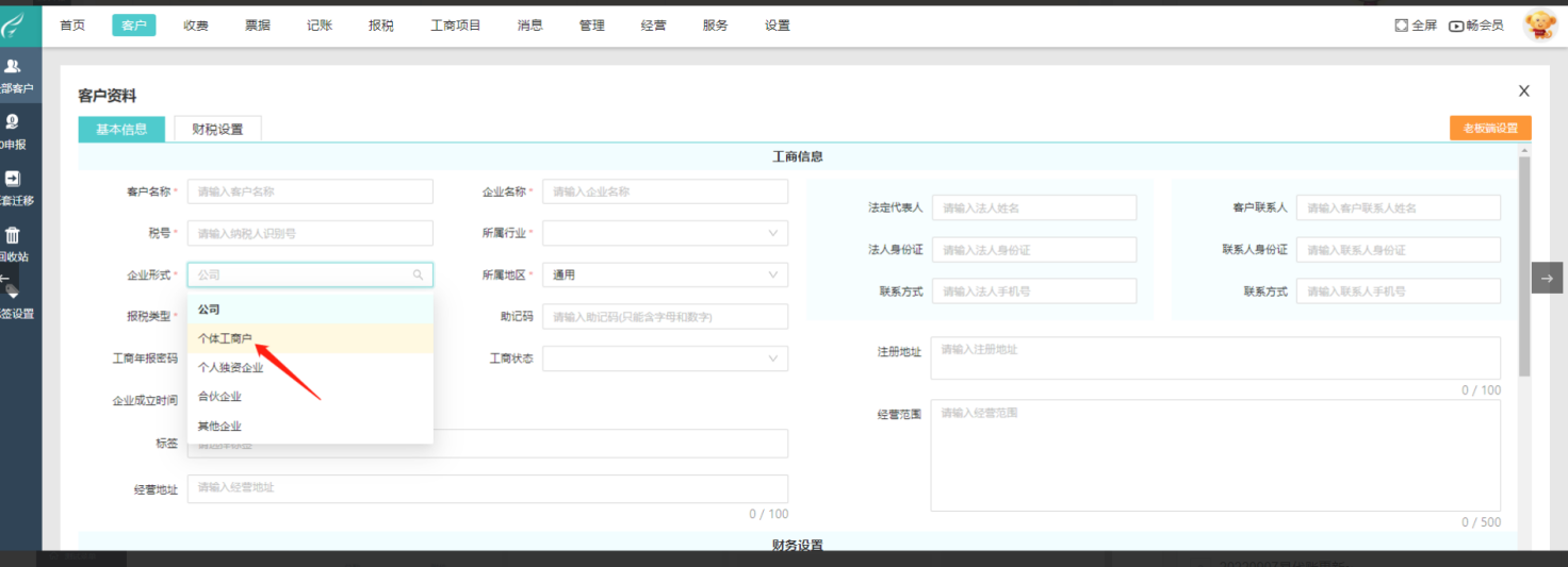 易代账报税采集时,报税采集信息识别到客户是个体工商户,系统会自动更新客户资料的企业形式为个体工商户,财税设置-税务信息也会进行更新。
