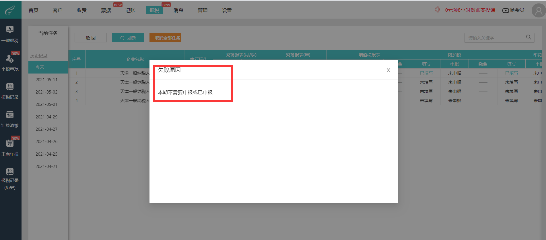 特别说明:机器人申报需要一定的时间(每户大概2-5分钟,受当地电子税务局和网速的影响),后台执行申报时用户无需停留在某个界面等待,可以继续其他工作操作,过一会可以回到一键报税或操作记录界面查看申报情况。