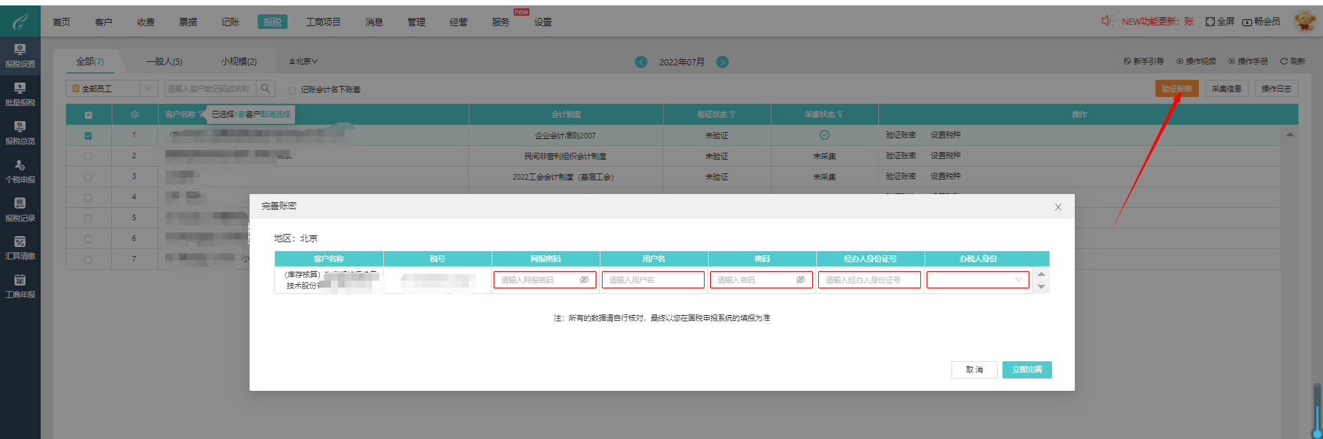 授权后,点击右上角的【验证账簿】,手动录入网报密码、用户名、密码、经办人身份证、办税人身份,后点击立即完善;