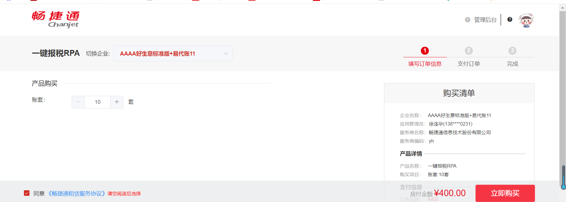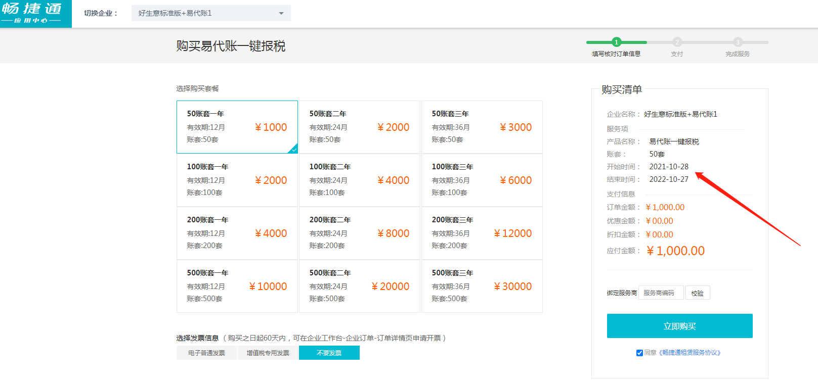 1、选择地区—上海(etax),一键报税界面上方会提示【立即购买】,点击购买进入购买界面,1账套20元一年,50账套按年起卖,50账套一年1000元,100账套一年2000,以此类推。