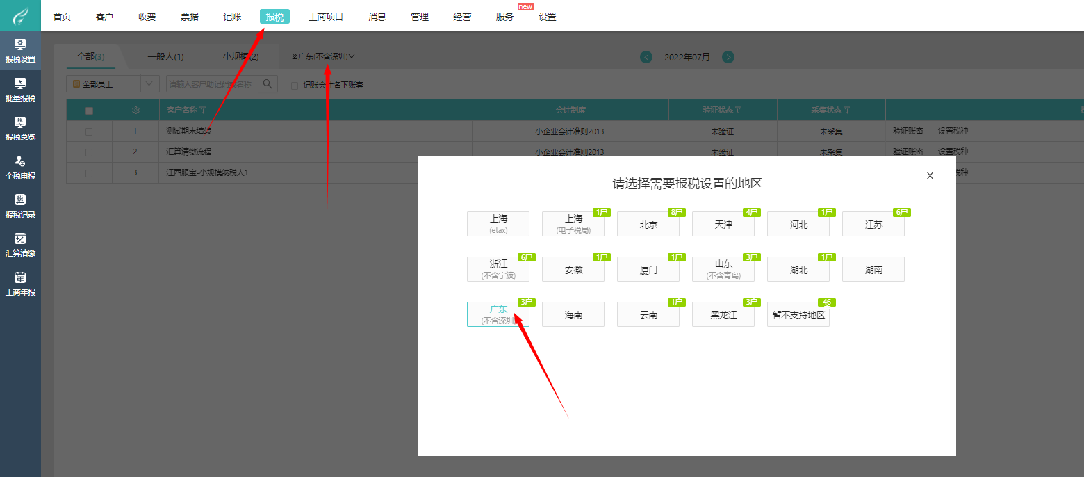 易代账工作台依次点击【报税】--【报税设置】左上角选择地区。