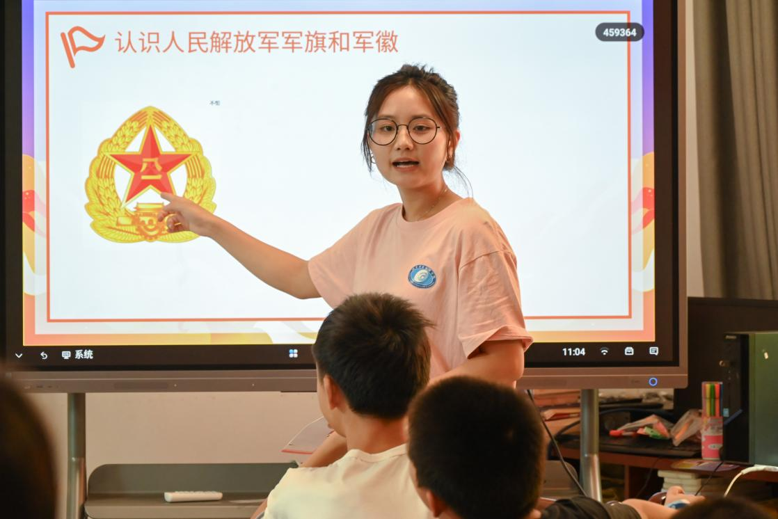 “同学们,从这则视频你们看到了什么?”一位支教队员问道。一位初二的学生站起来说:“老师,我看到了曾经的中国,我认为这个事件是在警示我们要牢记历史,勿忘国耻。”课堂上,支教队员以“视频宣传+多媒体演示+知识问答+手工制作”的形式,围绕建党节和建军节的由来、党旗、团旗、香港回归等相关红色知识向学生进行讲解。期间,志愿者还现场演示了简易国旗升降装置的制作过程,学生合作完成了升降装置制作并尝试升起升降台上的国旗。课堂最后,师生们同唱《紫荆花盛开》,学生自觉地挥舞手中的红旗,放声歌唱,表达对祖国的热爱。