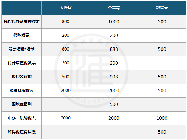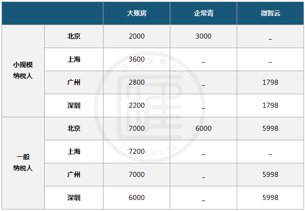 大账房、企常青、微智云代理记账公司收费标准和价格