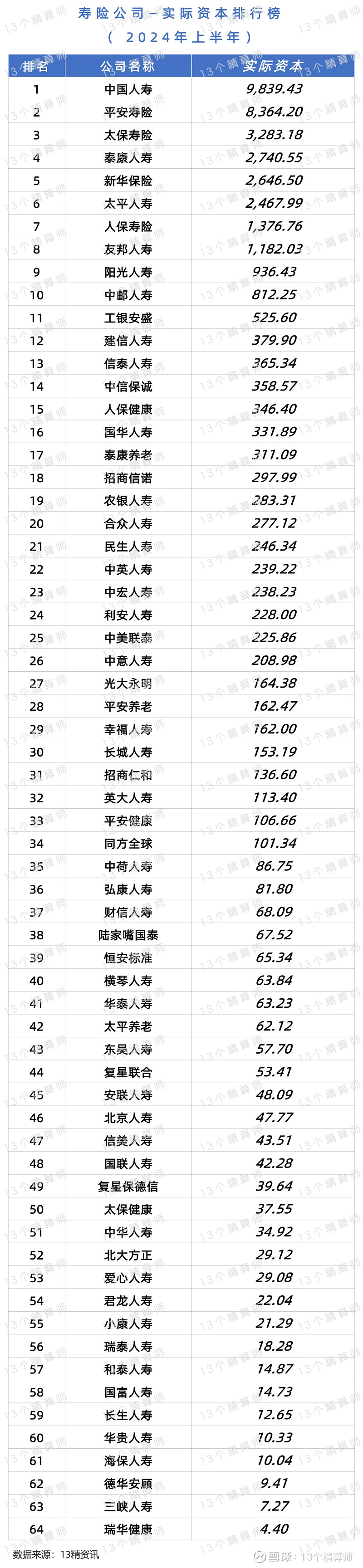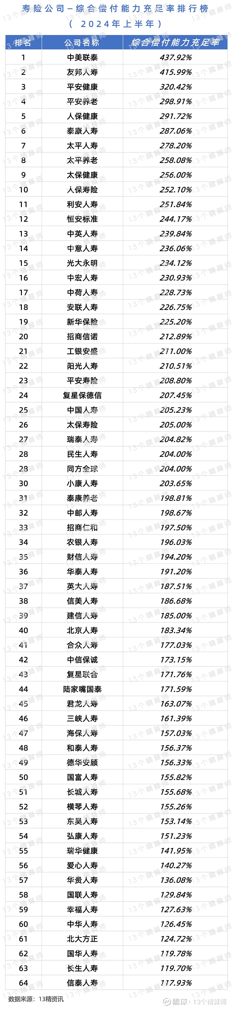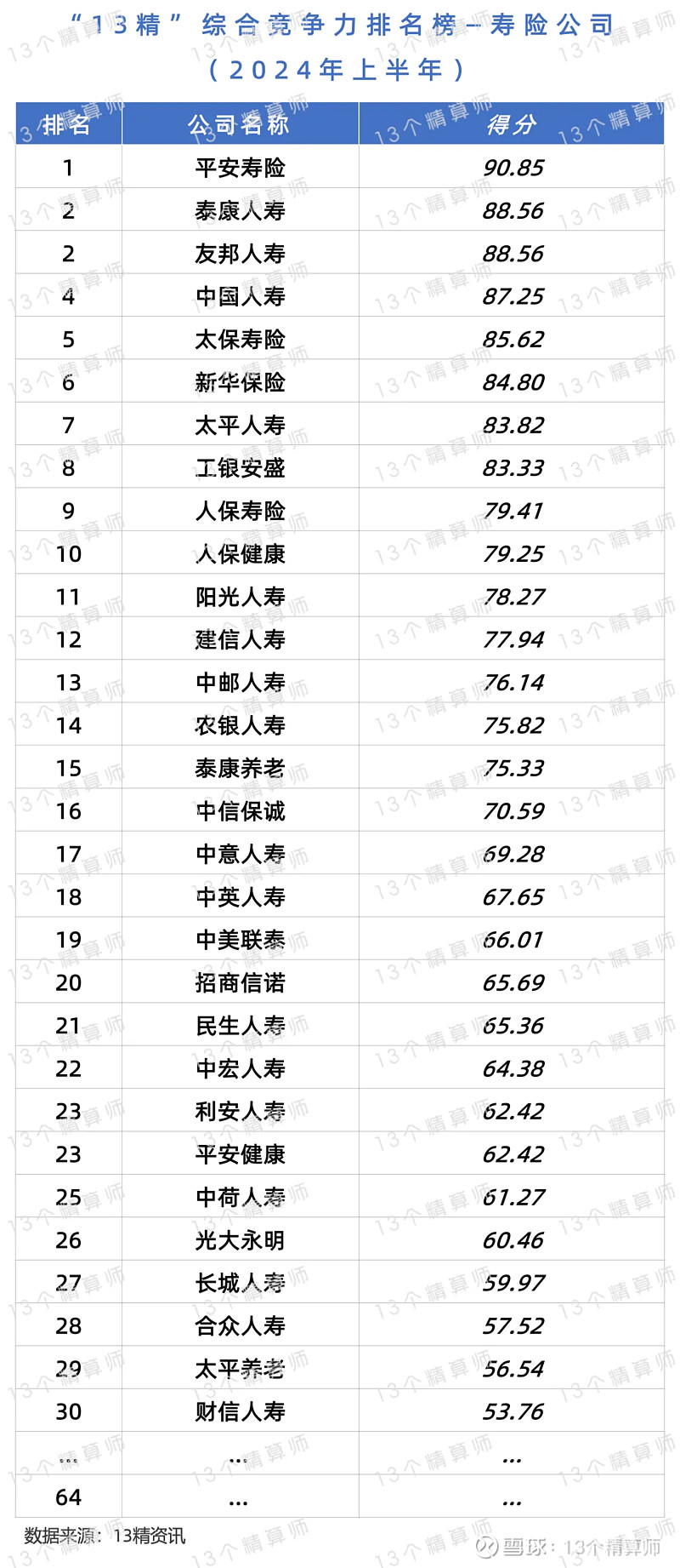 2024年上半年寿险公司“13精”综合竞争力排名榜:平安第一、泰康和友邦并列第二 其实,分