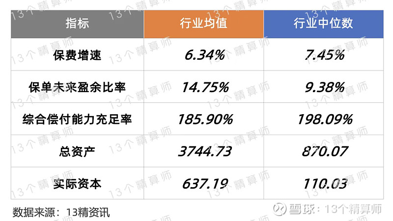 “13精”在整理竞争力排名榜的时候,还对行业整体的保费增速、总资产等指标进行了均值和中位数的计算,以便大家按照自己公司的相应指标与之对应。