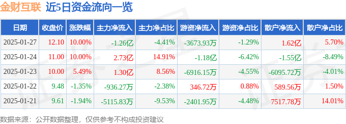 证券之星消息,金财互联1月27日涨停收盘,收盘价12.1元。该股于14点12分涨停,2次打开涨停,截止收盘封单资金为6214.47万元,占其流通市值0.74%。