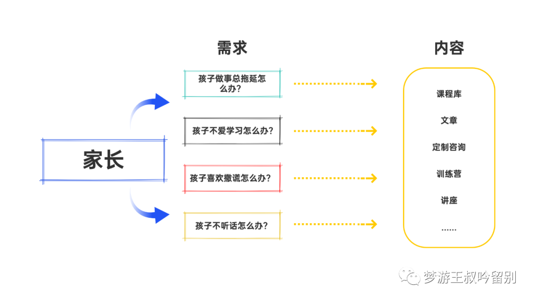 以往的家庭教育服务平台的模式是平台提供内容,家长从平台提供的内容中选择自己想要的完成购买付费。本质是发现家长需要解决什么问题,匹配需求,提供相应的课程。