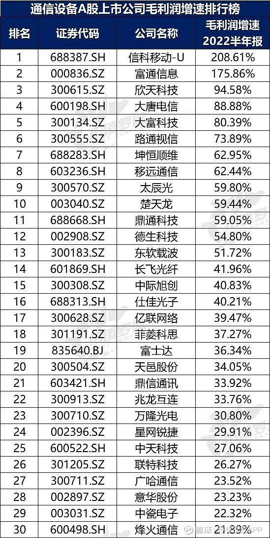 图7:通信设备行业A股上市公司毛利润增速排行榜