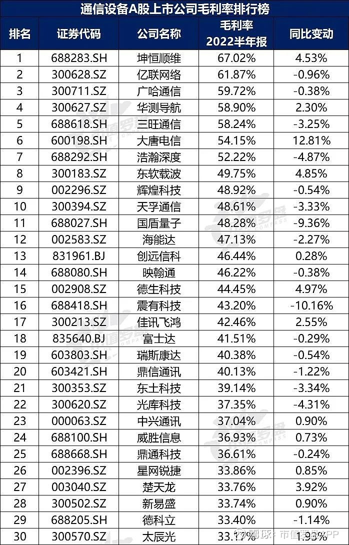 2022上半年通信设备行业A股上市公司中毛利率超过50%的有7家。其中,榜单前三发生改变,困恒顺维(67.02%)代替亿联网络排名第一,亿联网络(61.87%)退居第二,广哈通信(59.72%)代替三旺通信排名第三。较去年同期,35家公司毛利率改善,49家毛利率下滑。