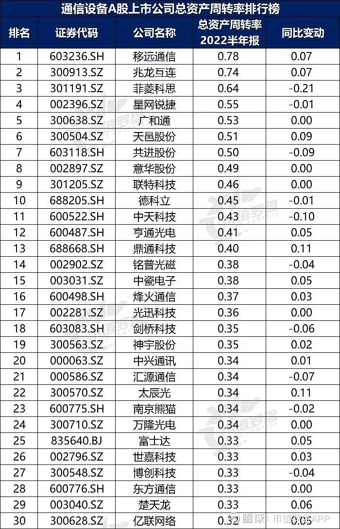 2022上半年通信设备行业A股上市公司有22家公司总资产周转率低于0.2,榜单前三发生改变,移远通信(0.78)代替菲菱科思排名第一,兆龙互联(0.74)排名第二,菲菱科思(0.64)退居第三。较去年同期,42家公司资产利用效率提高,42家公司资产利用效率降低。