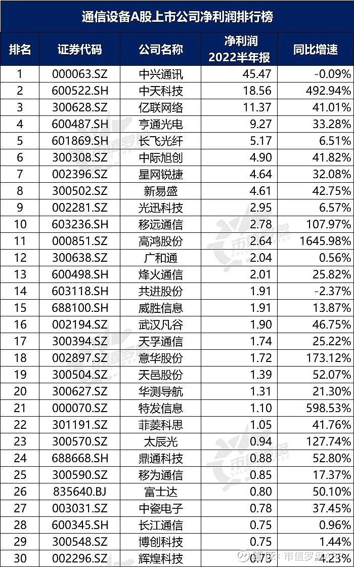 其中,3家企业净利润规模突破10亿元。榜单未发生改变。2022上半年净利润第一名是中兴通讯(45.47亿元),第二名是中天科技(18.56亿元),第三名是亿联网络(11.37亿元)。
