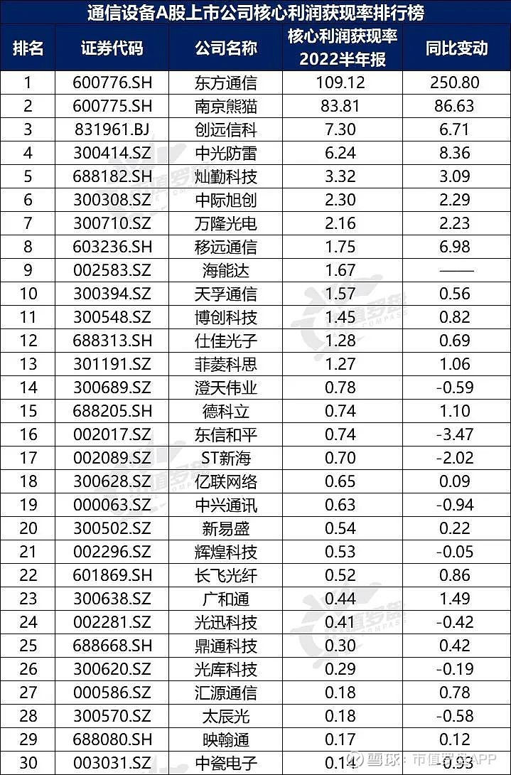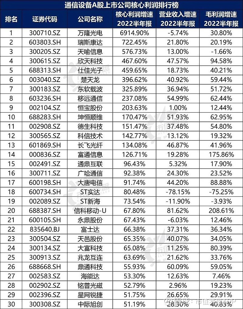 2022上半年通信设备行业A股上市公司33家核心利润增长,14家核心利润出现下滑。