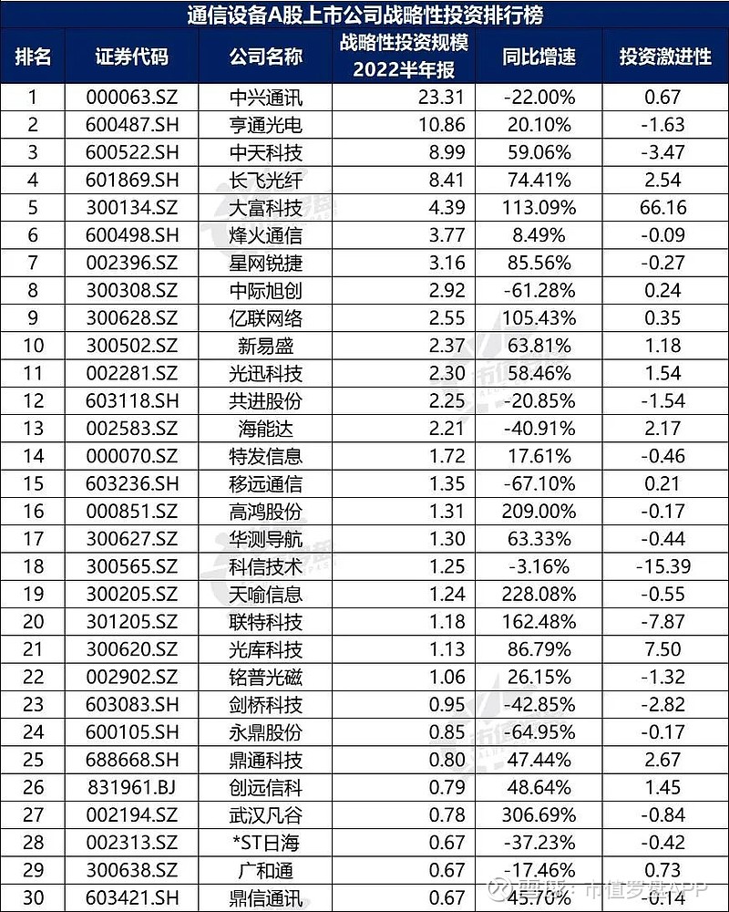 图17:通信设备行业A股上市公司战略性投资排行榜