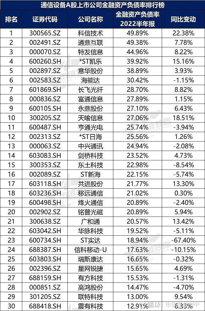 图19:通信设备行业A股上市公司金融资产负债率排行榜
