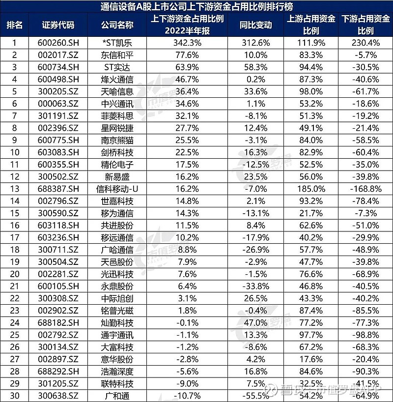 图15:通信设备行业A股上市公司上下游资金占用比例排行榜