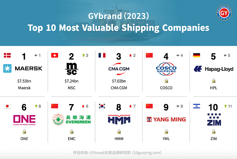 7月3日,国际权威品牌价值评估机构GYbrand发布了“2023全球航运公司品牌价值10强榜单”(The World’s Top 10 Most Valuable Shipping Companies of 2023)。其中,马士基蝉联“全球最具价值航运公司”,地中海航运和达飞海运分列二三名。前10强名单中,中远海控、长荣海运、阳明海运等3家中国企业上榜。
