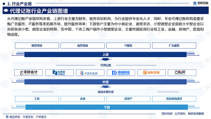 从代理记账产业链结构来看,上游行业主要为财务、税务培训机构,为行业提供专业化人才,同时,专业代理记账机构需要采购广告服务,IT服务等来拓展市场,提升服务效率;下游客户主要为中小微企业,通常来讲,小型微型企业是除大中型企业以外的各类小型、微型企业的统称,在中国,个体工商户视作小型微型企业,主要终端应用行业有工业、金融、房地产、贸易和物流等。