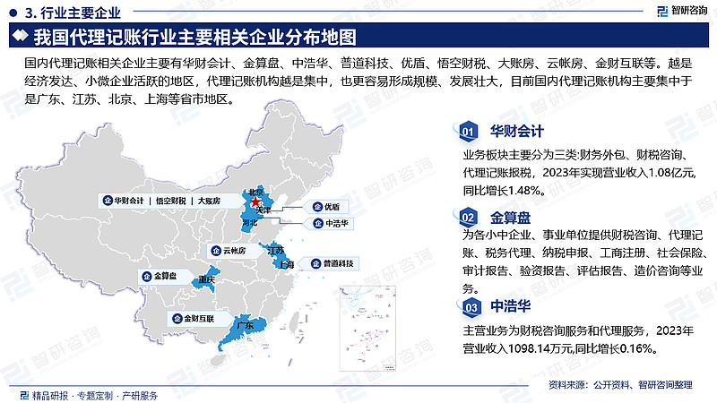 国内代理记账相关企业主要有华财会计、金算盘、中浩华、普道科技、优盾、悟空财税、大账房、云帐房、金财互联等。越是经济发达、小微企业活跃的地区,代理记账机构越是集中,也更容易形成规模、发展壮大,目前国内代理记账机构主要集中于是广东、江苏、北京、上海等省市地区。