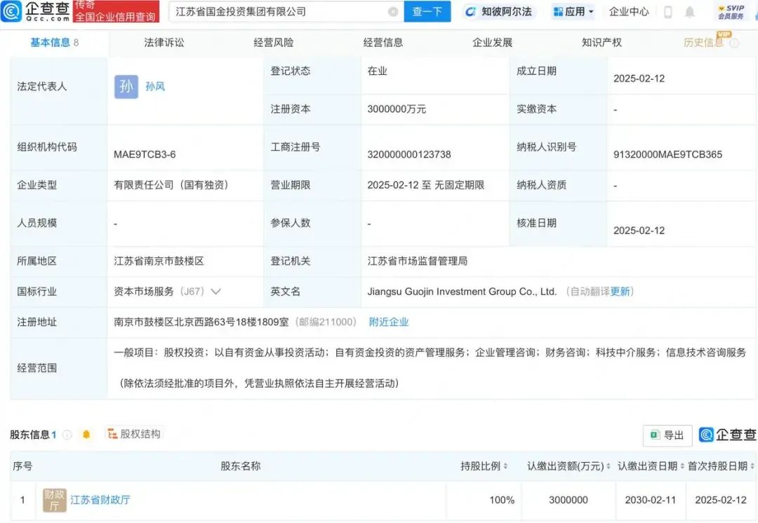 2月13日,记者从天眼查App获悉,江苏省国金投资集团有限公司于2月12日登记成立,法定代表人为孙风,注册资本300亿元人民币,经营范围包括股权投资、以自有资金从事投资活动、自有资金投资的资产管理服务、企业管理咨询、财务咨询等。公司股东信息显示,该公司由江苏省财政厅全资持股。