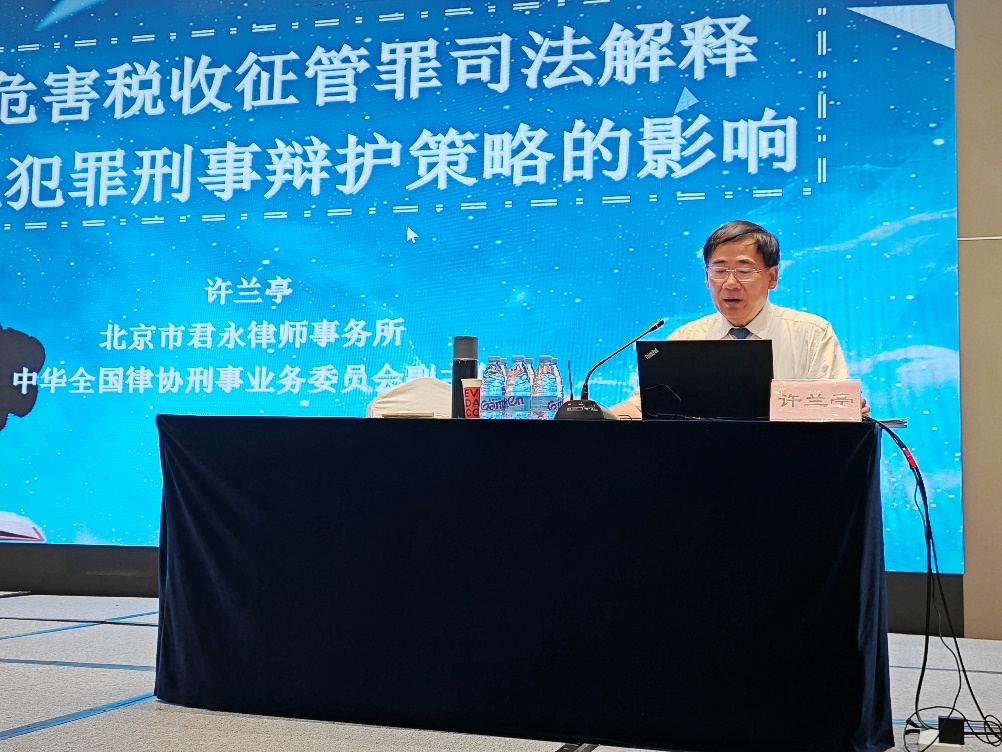 8月17日下午13:30-15:00,全国律协刑事专业委员会副主任、北京市君永律师事务所名誉主任许兰亭先生以“两高危害税收征管罪司法解释对涉税犯罪刑事辩护策略的影响”为主题进行了专题授课。课程共分为两个部分,第一部分对“两高”危害税收征管罪司法解释予以解读。他介绍了虚开增值税专用发票罪的界定,指出如果行为人的目的不是为了骗取抵扣税款,并且没有因此导致税款损失的话,则不构成此罪。同时介绍了虚开增值税专用发票罪与其他涉税犯罪的区别,例如虚开增值税专用发票和逃税罪、非法出售增值税专用发票罪之间的界限,共同犯罪理论在界定构成何罪的实际运用等。第二部分他就“刑事辩护方法与技巧”进行授课,从精通实体法、掌握程序法、熟悉证据法等十个方面对辩护技巧进行了总结。