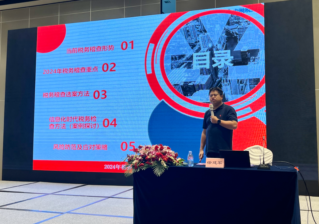 8月15日上午9:00-12:00,原某直辖市税务稽查局副局长、首批国家税务总局全国税务领军人才徐建军先生以“2024税务稽查形势与应对”为主题进行了专题授课。授课首先介绍了当前税务稽查的形势。其次,介绍了2024年税务稽查工作要点,如涉农、人力资源、医疗等领域,加强对文娱领域、网络主播等群体的税收监管,并加大对征管薄弱环节的整治,如合伙企业税收征管、核定征收的个独合伙企业、自然人代开等,并加大对研发费加计扣除等税收优惠措施的合规性审查。然后,介绍了税务稽查选案方法,包括举报信、税务其他部门移送、其他外单位移送、上级部门交办督办、稽查部门自主选案、随机抽查等多种方式及抽查比例等,并且介绍了在大数据时代,税务机关如何通过信息化稽查进行工作。最后,对广大企业如何风险税务防范及出现税务风险后如何应对进行了讲解。