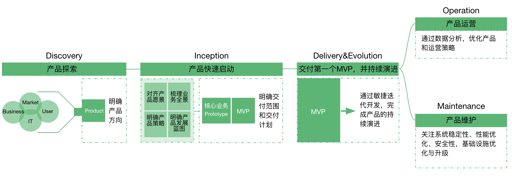 阶段三:产品交付与演进阶段在产品交付与演进(Delivery & Evolution)阶段,我们已经明确了产品的方向,并知道如何实施。敏捷交付项目正式启动,这将是一个持续且渐进的过程,伴随着频繁的迭代和交付。通过敏捷开发模式,从第一个MVP(最小可行性产品)开始,产品将在每个迭代中持续交付功能和价值,并不断演进。