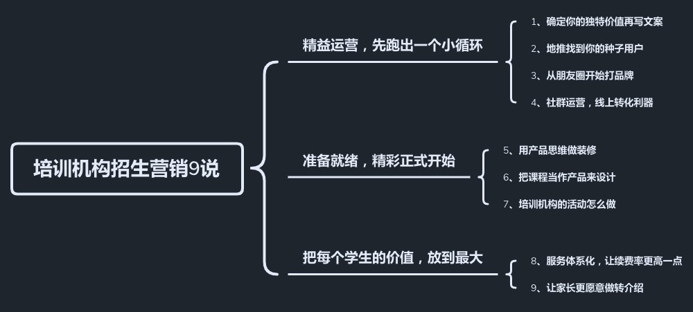 如果你是打算新开一家培训机构,更应该看看,我按机构从0-1的营销进程梳理了内容大纲,甚至包括了装修(做营销,要把握一切接触消费者的机会),每个都会有对应的方法+操作举例。