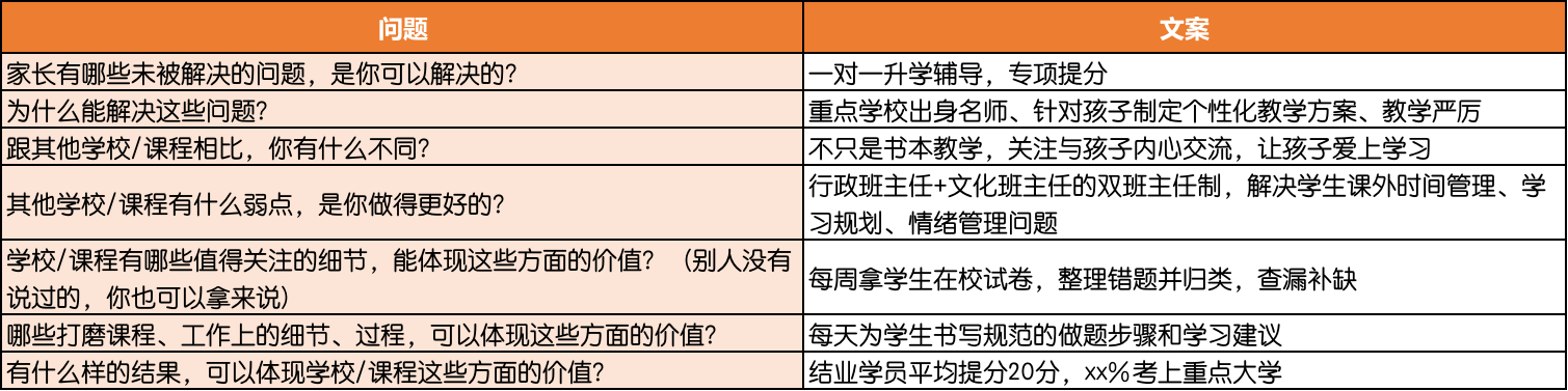 这些问题的答案,就是你能提供给家长的独特价值,也是文案的最佳素材。
