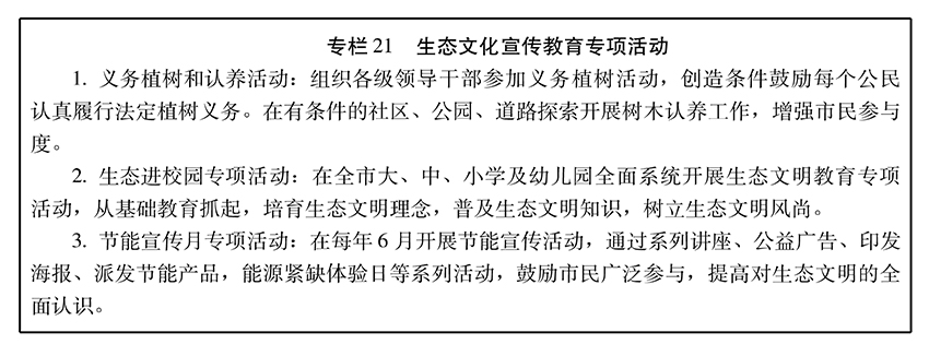加强生态文明教育,使生态文明理念“进校园,进课堂,进头脑,进行动”。鼓励支持中小学校幼儿园开展生态文明教育教学和科普活动,培育学生的生态文明意识、理念和行为习惯。将生态文明理论与实践等相关内容纳入各类职业教育、干部培训体系、企业员工培训和文化建设、社会文化建设等体系中,把生态保护教育作为市、区两级领导干部培训活动必修课程。在社区、镇、村举办生态保护教育培训活动。