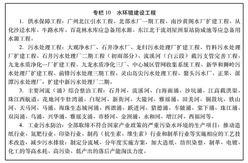 ——水资源。广州地处南方丰水区,年平均降雨量1800毫米,过境客水资源量达1860.24亿立方米,可利用量为397.96亿立方米;本地水资源总量79.79亿立方米,可利用量为28.38亿立方米。城市供水水源以地表水为主,主要分布在西江、北江、东江和流溪河四个片区,全市城市集中式饮用水水源地水质达标率100%。主要江河水质总体保持稳定,2015年地表水水质优良比例57.2%,国控、省控断面水质达标率为82.1%,珠江广州河段平均水质保持Ⅳ类。定期发布水质监测信息的53段重点整治河涌中,5段河涌达到或优于V类水体,48段河涌属劣V类水体,未达V类水质河涌的主要污染指标包括氨氮、总磷和化学需氧量,呈耗氧性有机污染特征。截至2015年底,全市共有47家水厂,总供水能力750万立方米/日;建有污水处理厂48座,城市污水日处理能力471.18万吨,全市城镇污水处理率达93.22%。