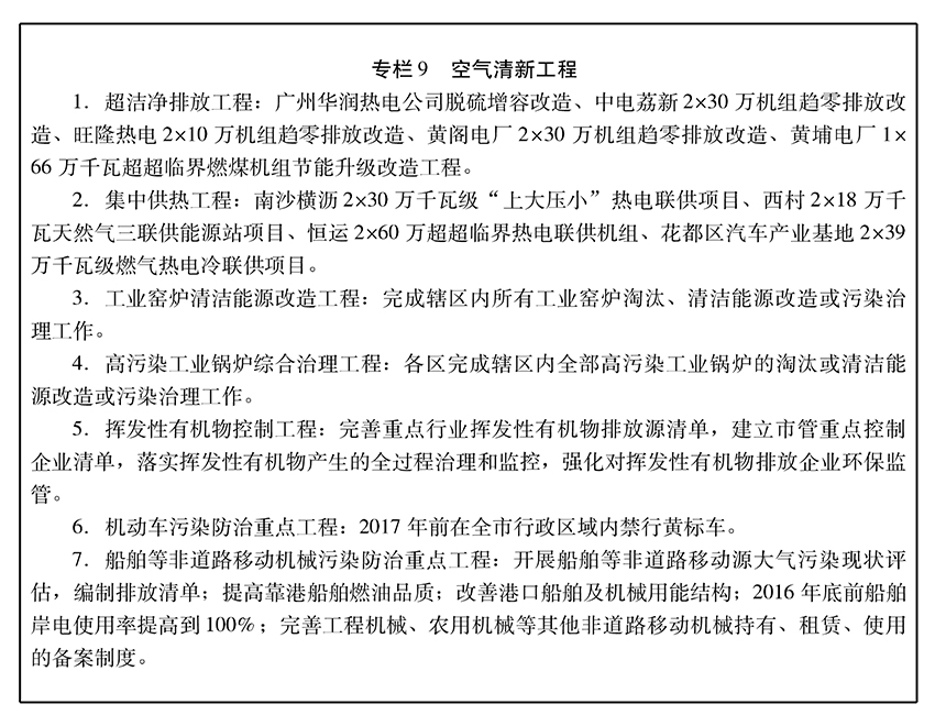 全面推进大气污染综合治理,协同控制可吸入颗粒物(PM10)、细颗粒物(PM2.5)、二氧化硫(SO2)、氮氧化物(NOX)、挥发性有机物(VOCS)、臭氧(O3),切实改善空气环境质量。推进二氧化硫、氮氧化物总量控制,严格大气污染物排放许可管理,新建排放二氧化硫、氮氧化物的工业类建设项目实行2倍替代。除集中供热和热电联产外,不再新建、改建、扩建燃煤发电机组和高污染燃料锅炉(含自备发电锅炉),在不增加装机规模和实现煤炭消费减量前提下,积极推进珠三角地区存量老旧落后机组“上新关旧”节能减排改造升级建设,把煤炭消费总量指标作为用煤项目审批的重要参考要素,实施煤炭总量控制和减量替代。