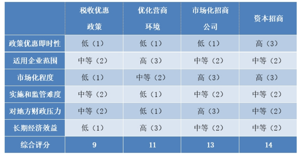 在上述分析基础上,本文以如下评分标准,对各类招商工具进行多维度对比评分。综合评分标准为:除了“实施和监管难度”、“对地方财政压力”项,其余项目均为低记1分,中等记2分,高记为3分;“实施和监管难度”、“对地方财政压力”项,低记为3分,中等记为2分,高记为1分。