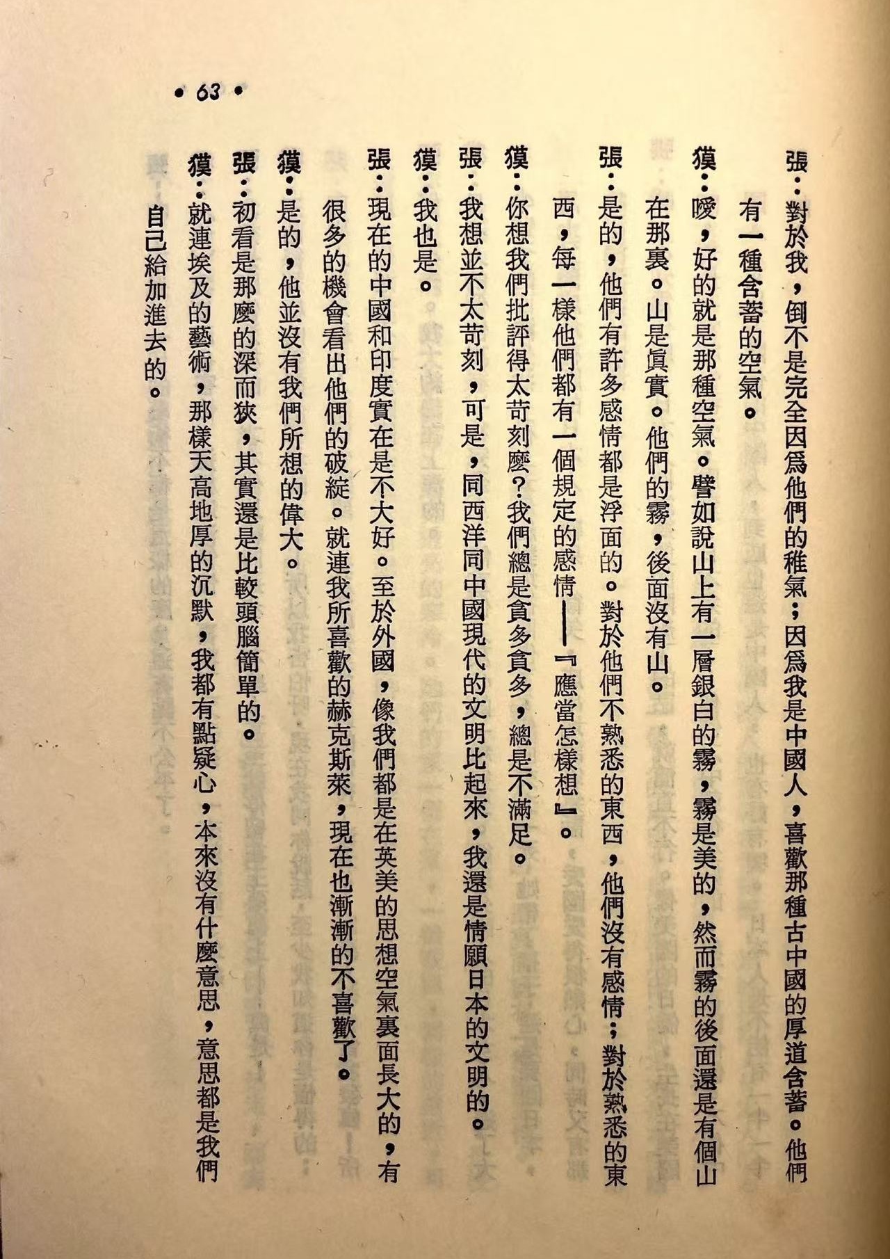 张:现在的中国和印度实在是不大好。至于外国,像我们都是在英美的思想空气里面长大的,有很多的机会看出他们的破绽。……