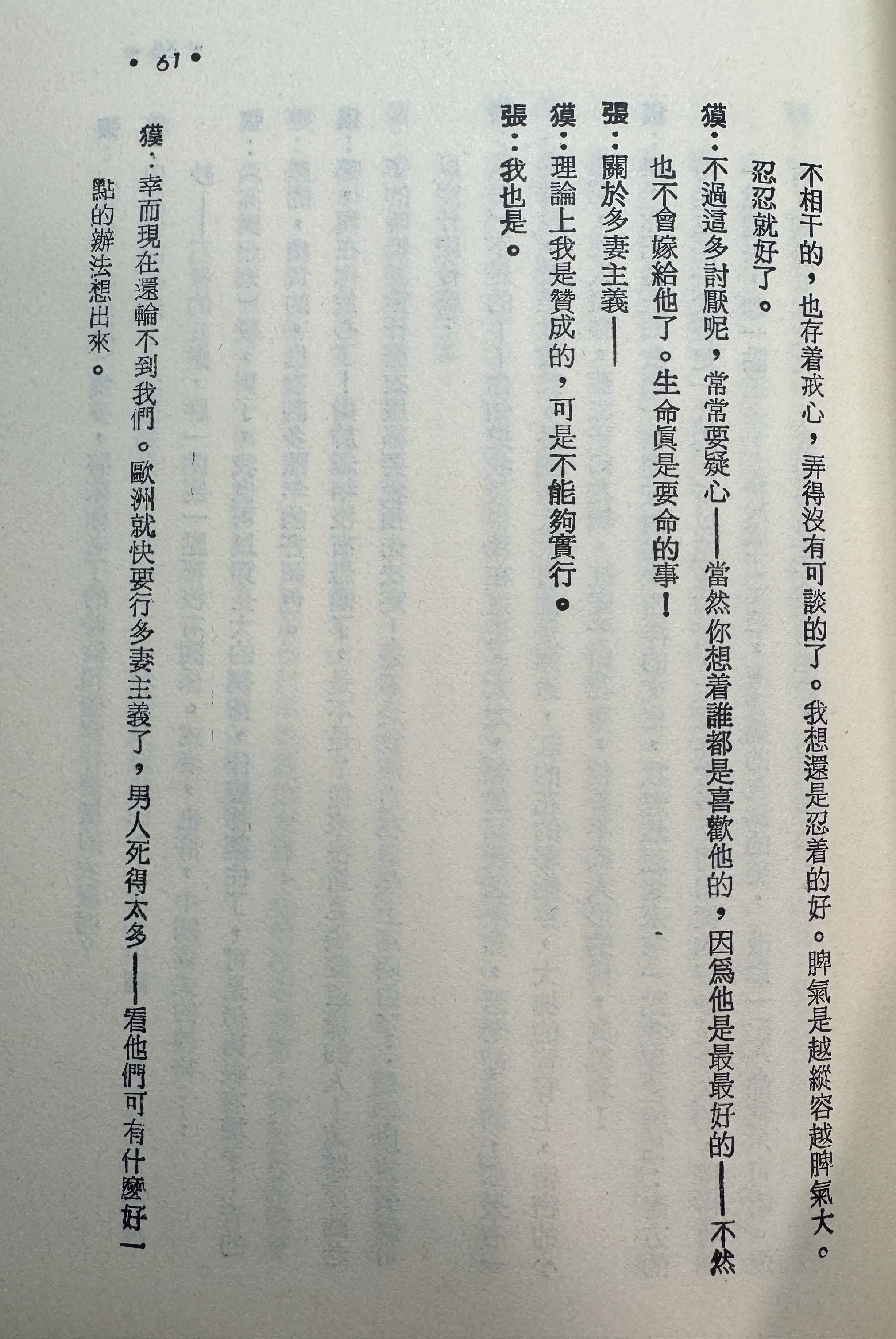 獏:幸而现在还轮不到我们。欧洲就快要行多妻主义了,男人死得太多——看他们可有什么好一点的办法想出来。