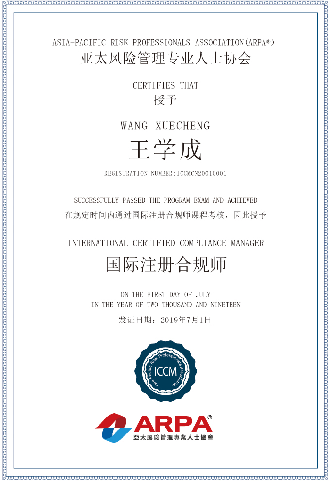 • 证书名称:ARPA®国际注册合规师(International Certified Compliance Manager, ICCM)
