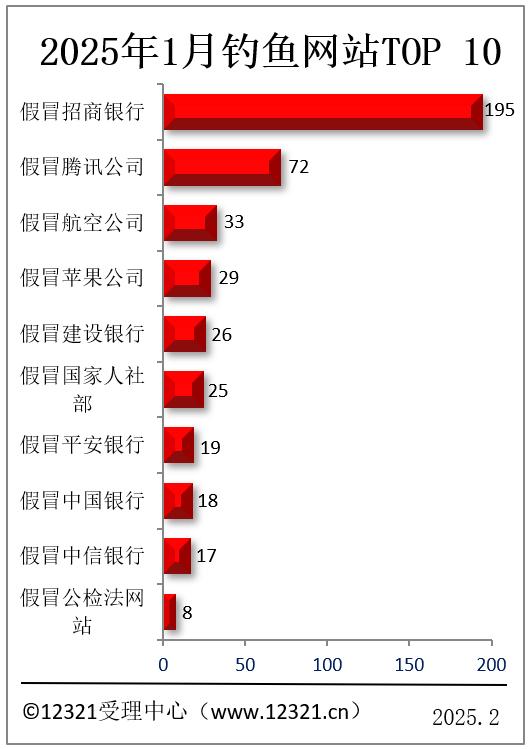 根据12321网络不良与垃圾信息举报受理中心()接到网民投诉的短信、邮件、网站等信息,2025年1月,被投诉的钓鱼网站前十名如下: