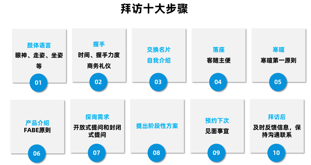 真正拜访客户时,有十个步骤,每一步都有注意事项,可以放在我们公司内部的销售训练里,分别扮演拜访人和被访人,反复训练