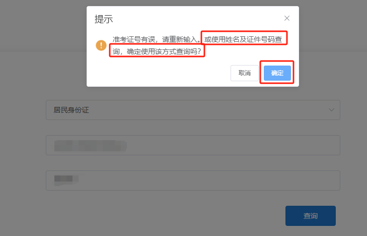 第一步:正常输入“证件号”和“准考证号”(不记得就随便填写,但不能留空)进行“查询”,系统会提示“准考证号有误,请重新输入。”同时提示用户可以选择“使用姓名及证件号码查询,确定使用该方式查询吗?”点击“确定”即可。