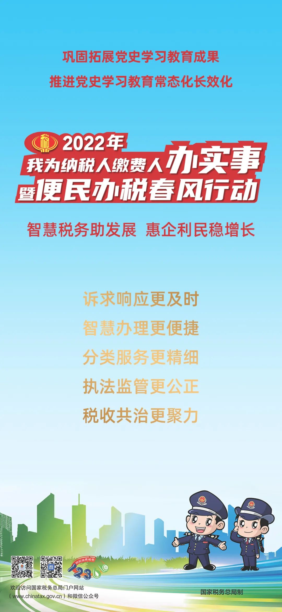 便民办税惠万家,春风行动暖人心。为深入贯彻党的十九届六中全会精神,巩固拓展党史学习教育成果,不断提高纳税人缴费人满意度和获得感,按照总局省局统一部署,国家税务总局潍坊市税务局决定,2022年以“智慧税务助发展·惠企利民稳增长”为主题,连续第9年开展“我为纳税人缴费人办实事暨便民办税春风行动”,推出5大类20项80条便民办税缴费举措,加快推动智慧税务建设,加快推进精确执法、精细服务、精准监管、精诚共治,持续深化税务系统“放管服”改革,不断优化税收营商环境。