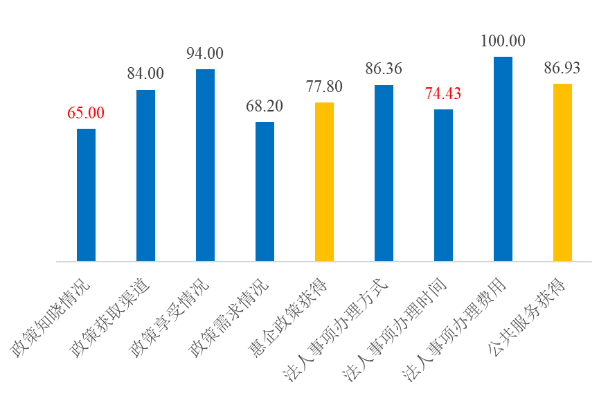 在获得内容方面,惠企政策获得相关四项指标的平均得分(77.80)低于公共服务获得相关三项指标的平均得分(86.93)。在惠企政策获得相关的四项指标中,“政策享受情况”指标得分较高,为94.00;“政策知晓情况”指标得分较低,为65.00。在公共服务获得相关的三项指标中,“法人事项办理费用”指标得分较高,为100.00;“法人事项办理时间”指标得分较低,为74.43。