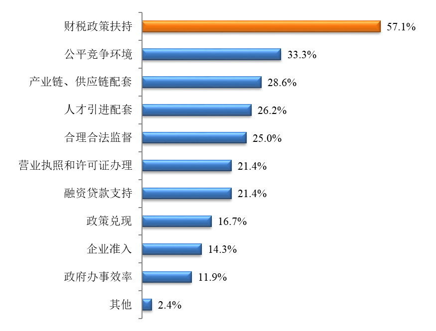 从民营和外资企业实际发展需求出发,57.1%的受访企业认为“财税政策扶持”方面亟待改进,其次是“公平竞争环境”(33.3%)和“产业链、供应链配套”(28.6%)。一家制造企业希望“降低企业税收负担”,一家医疗科技公司希望“补贴如果填报信息错误能够给予核实且给予修改机会”。
