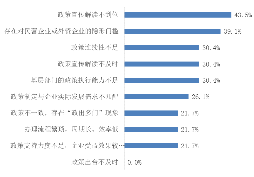 企业认为当前的惠企政策对企业发展实际帮助不够的原因主要是“政策宣传解读不到位”(43.5%)、“存在民营企业或外资企业的隐形门槛”(39.1%)等。一家医药科技公司希望增加“各类政策解读,企业申报中的指导和扶持”。