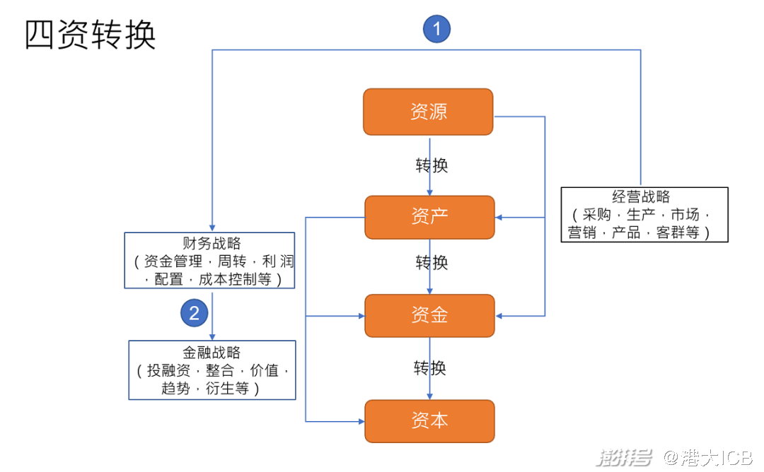 企业一般来说有四个“资”,资源,资产,资金,资本。企业把一些资源,不管是人、物、还是钱,转化成企业可运作的资产;把资产通过运营、生产、包括包装等等转化成产品与服务,产品、服务卖出去后变成资金;资金通过我们的现金流,然后把企业做成资本化。