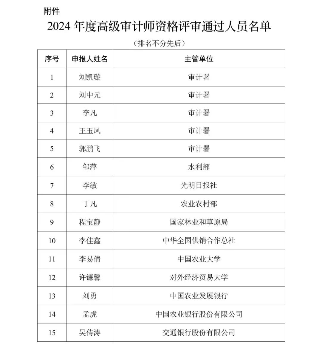 关于2024年度高级审计师资格评审结果公示的通知经审计署审计系列高级职称评审委员会评审通过,拟确认刘凯璇等67人获得高级审计师资格(名单附后)。按照《职称评审管理暂行规定》等的规定,现予公示。公示期5个工作日。对评审结果有意见者,请于2025年3月20日17时前向审计署审计系列高级职称评审委员会办公室如实反映,反映者须告知或签署真实姓名。联系电话(传真):010—50993485电子邮箱:education@audit.gov.cn附件:2024年度高级审计师资格评审通过人员名单