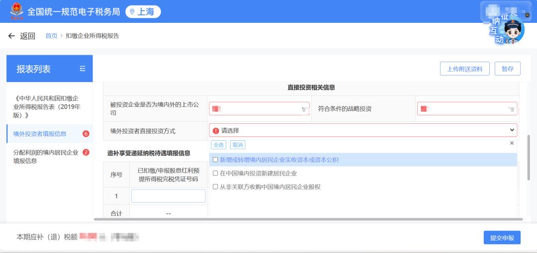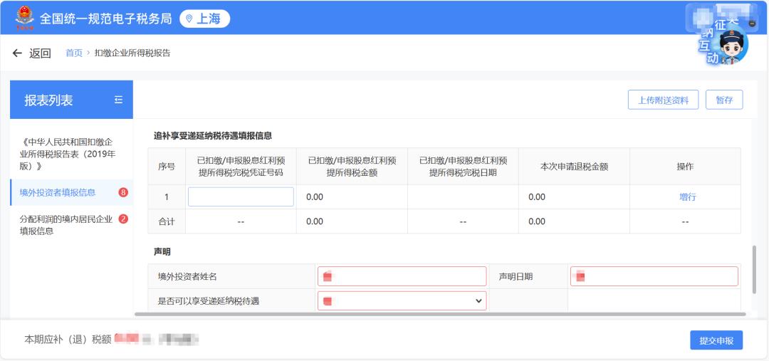 3.根据实际情况填写境外投资者填报信息及分配利润境内居民企业填报信息,点击提交申报。